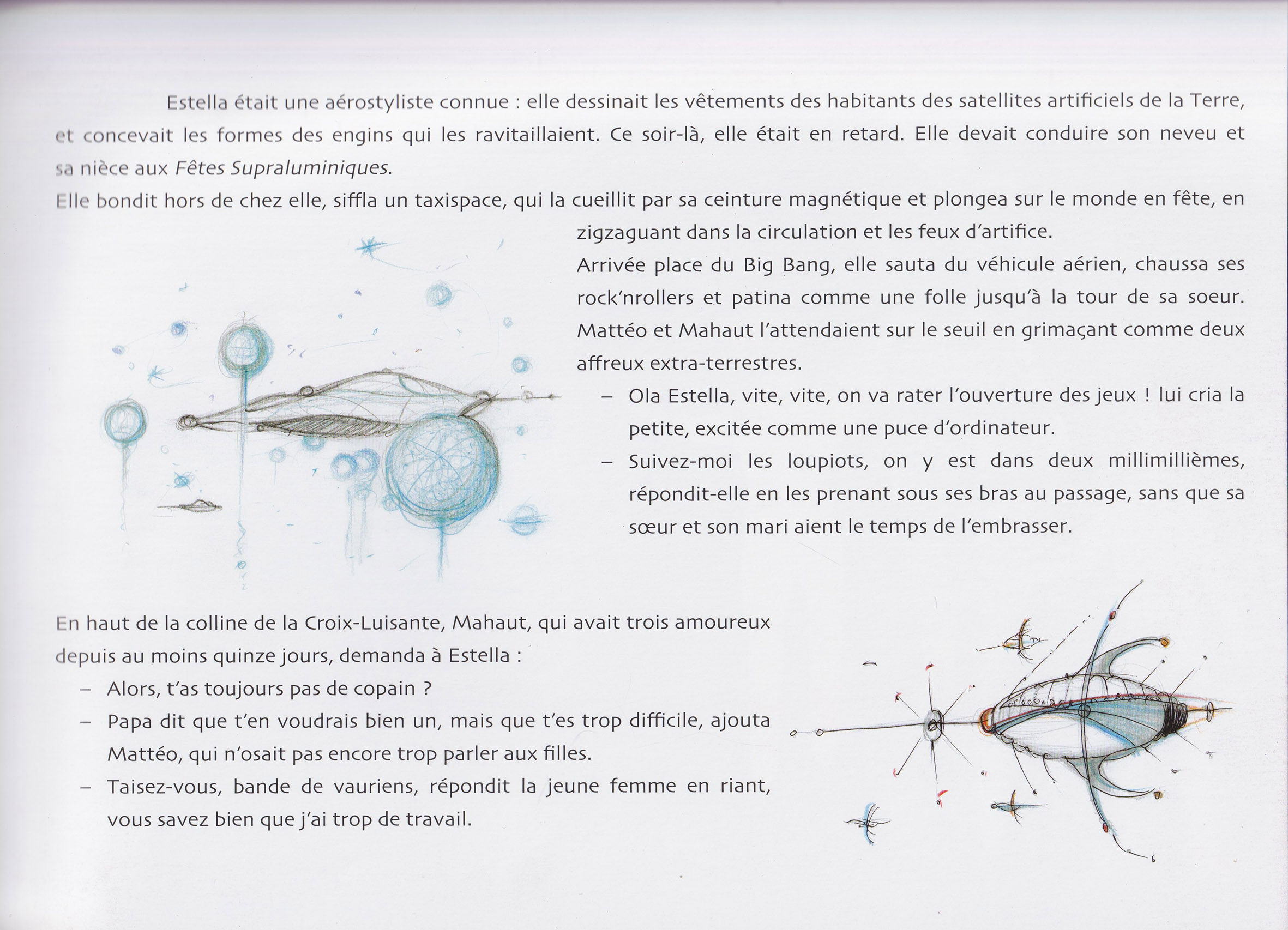 « Estella était une aérostyliste connue : elle dessinait les vêtements des habitants des satellites artificiels de la Terre et concevait les formes des engins qui les ravitaillaient. Ce soir-là, elle était en retard. Elle devait conduire son neveu et sa nièce aux Fêtes Supraluminiques. »